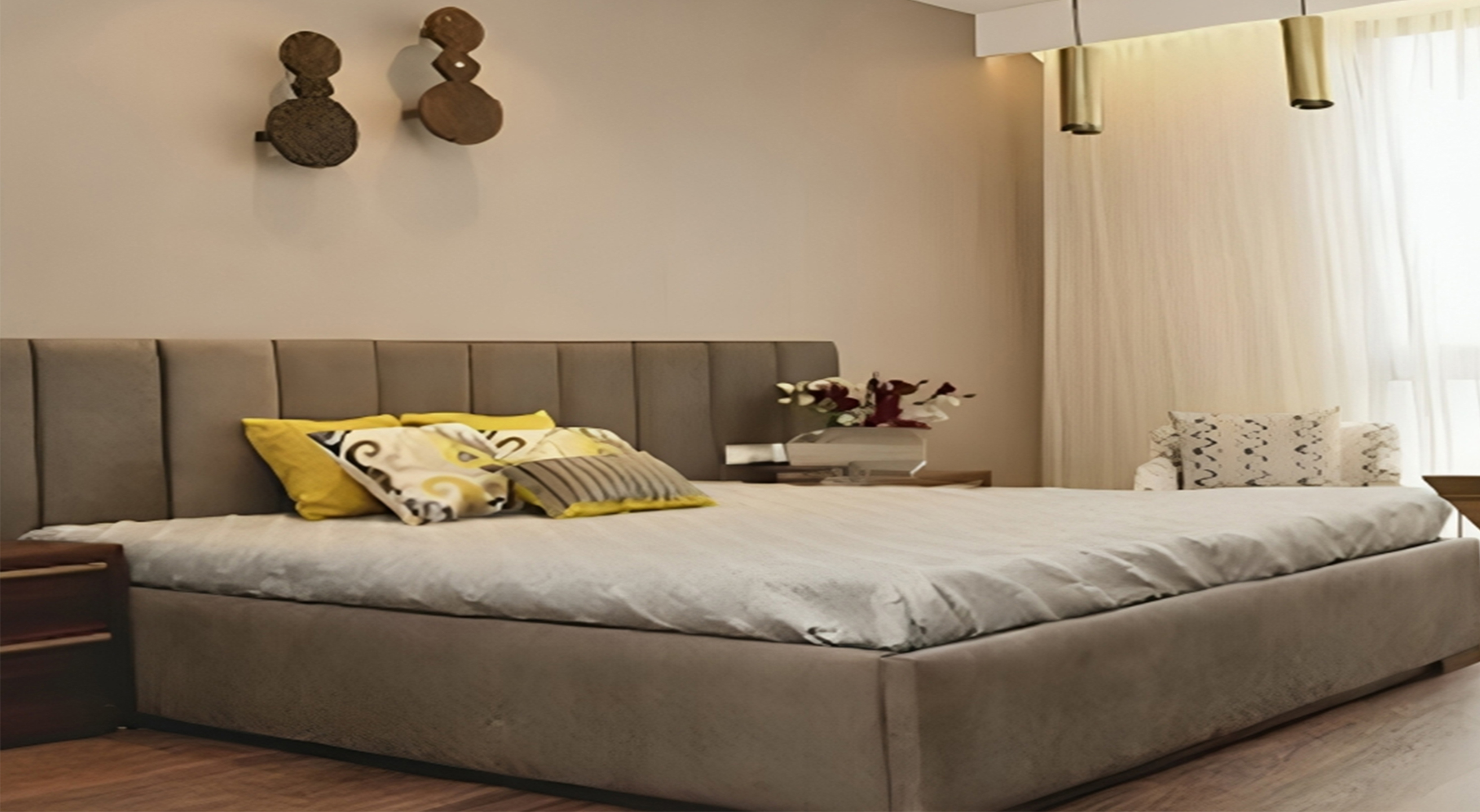 This bedroom design is a testament to timeless comfort and understated luxury. A plush upholstered bed forms the focal point, anchored by a soothing neutral palette that enhances relaxation. Accents of mustard yellow and patterned cushions add just the right pop of personality, while soft lighting and sheer drapes create a calming, light-filled atmosphere. Minimalist decor and clean lines meet rich textures and warm wooden tones, making this space feel both modern and inviting—a perfect blend of function and finesse. Because your bedroom should be more than a place to sleep—it should be your sanctuary.